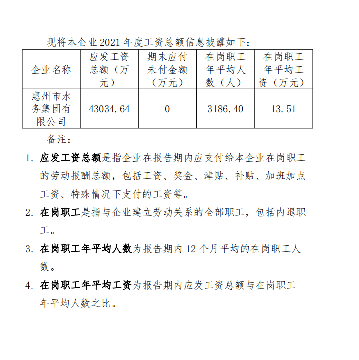 2021年惠州市水務(wù)集團(tuán)有限公司工資總額信息披露
